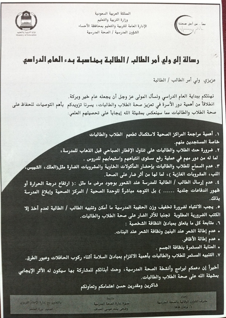 رسالة إلى ولي أمر الطالب الطالبة بمناسبة بدء العام الدراسي